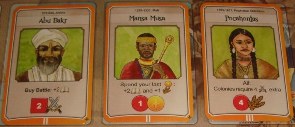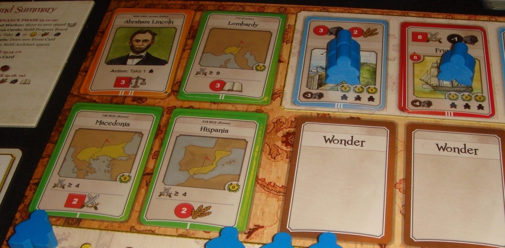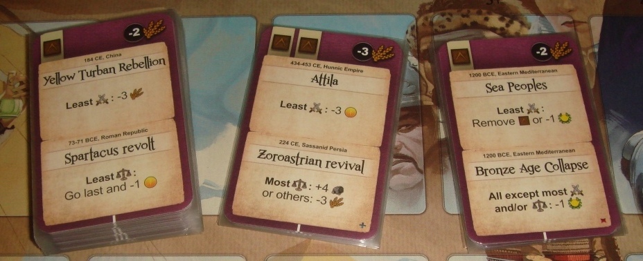 Новые события. После процветания вскрывается новая карта событий (фиолетовая), на ней указаны две исторические даты с бонусами и пенальти, которые затронут цивилизации ближе к концу раунда. Кроме того, вверху карты иногда имеется один или несколько дополнительных архитекторов, доступных на раунд (дополнительных потому, что некоторое их количество доступно всегда, и обуславливается оно числом игроков), а также число еды, которое потеряют игроки в фазе голода. Стоит отметить, что события тут иной раз бывают похлеще, чем войны.