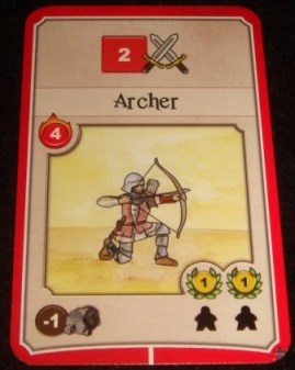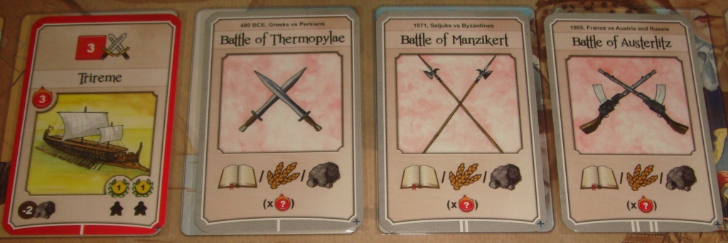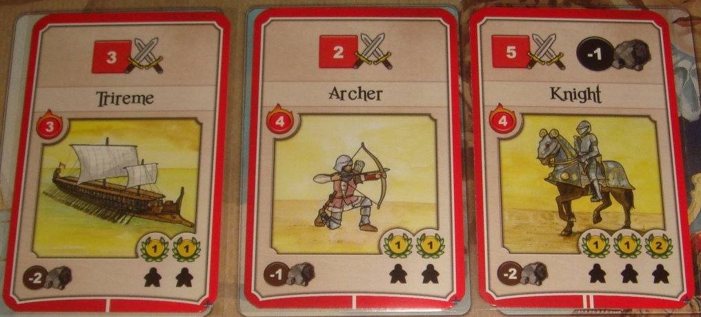 Сражения (серые). Приобретение карты сражения означает нападение на какое-то нейтральное войско. При этом карта сбрасывается, а игрок тут же получает на выбор один из указанных ресурсов в количестве, равном силе набега. Для определения сего показателя, достаточно взять самую сильную военную карту, на которой находится хотя бы один рабочий – сила набега указано в красном горящем кружочке. В принципе, таким образом отряды могут не только себя окупать, но и приносить дополнительные ресурсы.
