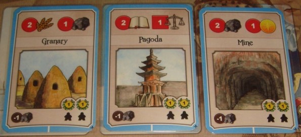 Строения (синие). О них я уже немного успел рассказать. Строения представляют собой различные учебные заведения, религиозные и культурные здания, шахты, заводы… в общем, всё, куда цивилизация может вложить свои средства для скорейшего развития и процветания. Планшет игрока имеет всего 5 мест под карты данного типа, это означает, что одновременно цивилизация может иметь лишь 5 строений. Вверху карты всегда указано два ресурса, которые она производит. Причём сочетания бывают самые разные, из-за чего перед игроком иногда встаёт непростой выбор, что накрыть, а что оставить. Что касается добычи ресурсов, то золото, камень, еду и знания синие карты приносят строго в фазу производства, а вот показатели стабильности и военной мощи меняются сразу же. Ах да, забыл сказать самое главное, строения абсолютно бесполезны, если на них нет рабочих, то есть “голые” карты, какими бы крутыми они не были, не принесут вам ничего. Следовательно, их нужно активировать миплами, что делается за камень – тематически это объясняется тем, что рабочий как бы строит это здание. Рабочих на одной карте может находиться сколь угодно, при этом бонус суммируется, но заменяя карту, они уходят в запас. И последнее, в конце партии миплы на строениях принесут победные очки, но не все, а ровно столько, сколько их указано на карте.