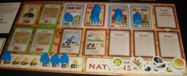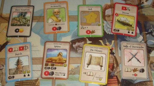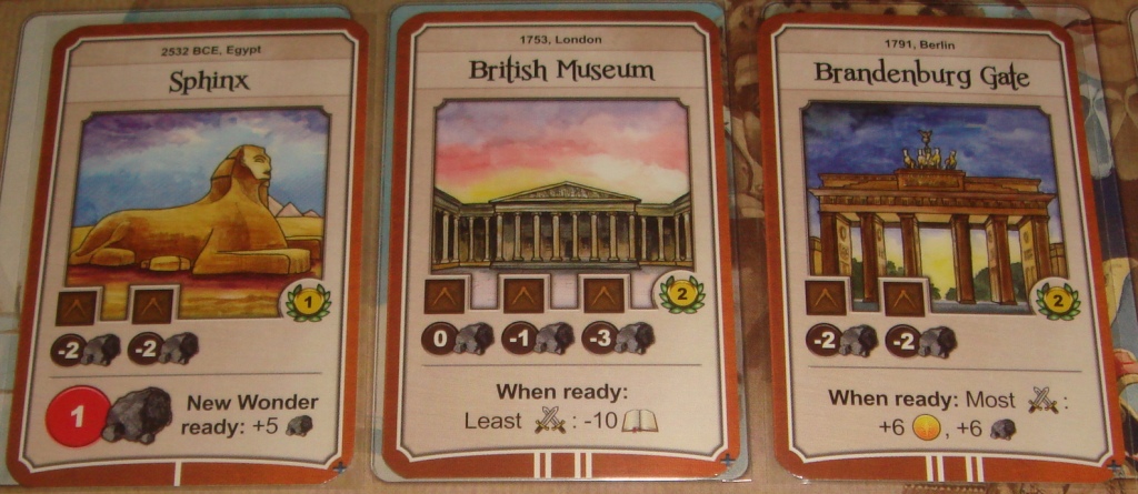 Чудеса Света (коричневые). Как видно из планшета игрока, в разработке у цивилизации может быть только одно Чудо, а готовых – целых пять. По свойствам Чудеса близки к колониям: они приносят победные очки, ресурсы и не требуют рабочих. Более того, некоторые из Чудес обладают постоянными полезными эффектами. Возвести же Чудо не так просто: делается это в несколько действий-этапов, и каждый этап требует определённое количество камня и кубик архитектора, который берётся из запаса на текущий раунд.