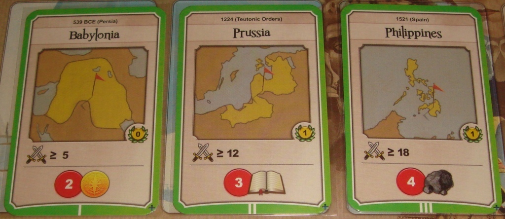 Колонии (зелёные). Чтобы приобрести карту колонии, мало просто потратить золото, требуется ещё наличие определённого уровня военной мощи. Правда, и награда будет немаленькой – колонии не только сами по себе приносят победные очки, но и производят ресурсы без необходимости посылать на них рабочих. К сожалению, одновременно у игрока может быть не более двух карт данного типа.