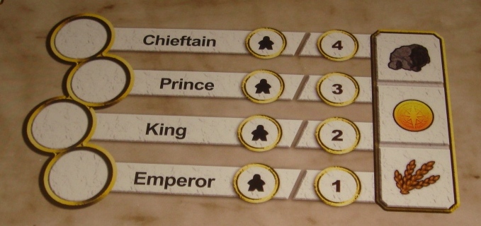 Эти пять построек уже изначально исчерпывают лимит синих (здания) и красных (военные отряды) карт, впоследствии их можно будет только улучшить, накрыв новыми. Как видно, помимо упомянутых построек, на планшете имеются разноцветные рамки под карты других типов, и на них также установлен строгий лимит. В нижнем правом углу планшета указан начальный капитал игрока, состоящий из некоторого количества рабочих, победных очков и трёх основных ресурсов – еды, золота и камня. Левее же расположился запас рабочих, доступных для найма по ходу партии. Не бесплатно, конечно.