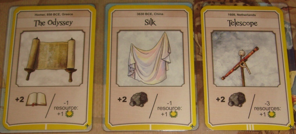 Очки. Помимо финального подсчёта очков, после каждого второго раунда происходит небольшой промежуточный, во время которого игроки получают по одному очку за каждую цивилизацию, находящуюся ниже их на треке знаний. Что касается подсчёта очков в конце партии, то багаж игрока складывается из: очков, полученных по ходу партии; очков за колонии и Чудеса Света; очков за рабочих на зданиях и военных картах; и очков за все-все-все ресурсы, которые складываются вместе и делятся на 10. Всё это фиксируется в блокнотике, после чего происходит поклонение цивилизации, набравшей очков больше всех.