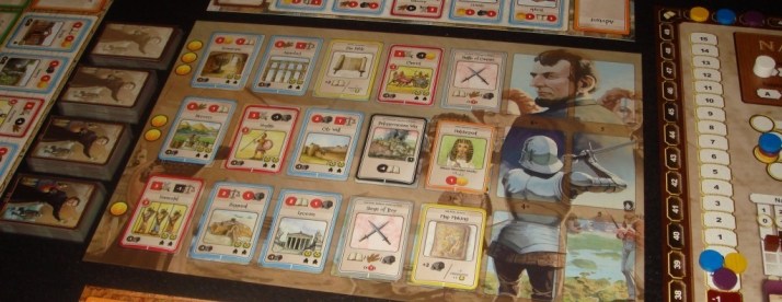 Карты золотой эпохи (жёлтые). Эти карты работают так же, как и сражения, но не требуют силы набега. Вдобавок, у игрока есть выбор, или взять указанный ресурс, или обменять лишние ресурсы на одно очко. Отмечу, что с каждой эпохой победное очко становится дороже.