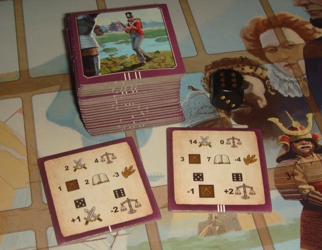 Военные отряды (красные). Военные карты работают точно так же, как и строения, более того, они входят в тот же самый лимит. Другими словами, у игрока может быть любая пропорция синих и красных карт, но общее их число не может быть больше пяти. Как показывает практика, обычно игроки раскошеливаются на 1-2 красные карты, так как отряды не только не приносят ресурсов, но ещё и сами кушать просят. Но это не умиляет их полезность, ведь сильная армия поможет пережить различные неблагоприятные события, подчинять колонии, совершать набеги на нейтральные войска, а также нагибать другие цивилизации, объявляя им войну. Напомню, что при манипуляциях, связанных с картами отрядов, пересчёт военной мощи происходит сразу же, вне зависимости от того, помещается ли фишка на карту или убирается с неё. В качестве напоминания, количество ресурсов, которые игрок получает/теряет незамедлительно (военная мощь и стабильность), указано в квадратике.