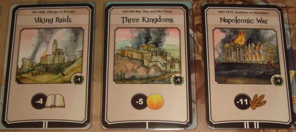 Война (чёрные). Война затрагивает все цивилизации, а игрок, купивший её, просто устанавливает планку, достигнув которую, можно избежать негативных последствий. Карта идёт на специальное место на центральном поле, напоминая о том, что за раунд может быть только одна война. После этого чёрный диск помещается на шкалу военной мощи на деление, где находится фишка игрока, инициировавшего войну. В конце раунда, а именно, после фазы производства, цивилизации, не сумевшие или не захотевшие повышать силу своей армии до уровня агрессора, получают пенальти в виде потери указанных на карте ресурсов и одного победного очка. Если по ходу раунда, инициатор войны увеличил свою военную мощь, то на диск это никак не повлияет, а вот, если он “сполз” ниже собственноручно установленной планки, то и он сам, как говорится, попадёт под раздачу.