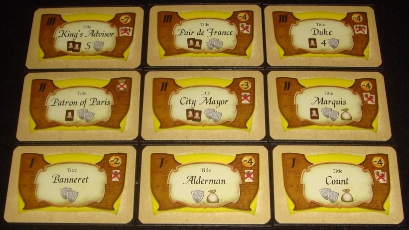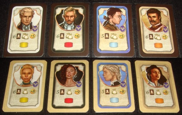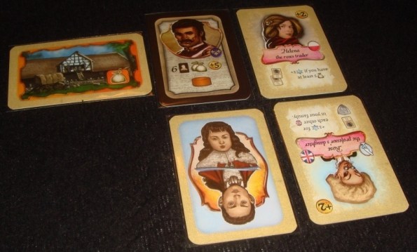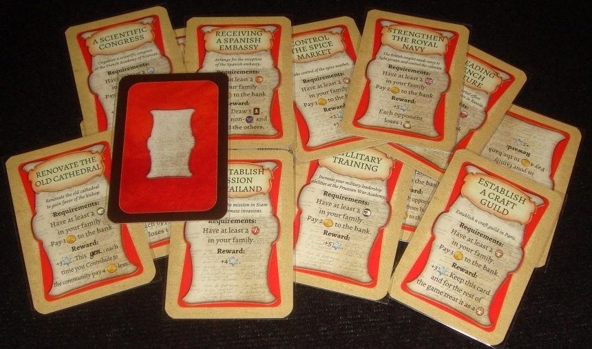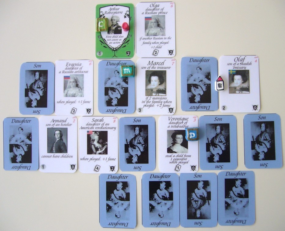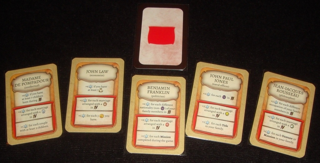 Династия игрока берёт начало с зажиточного француза или француженки, кому как милее – карточки двусторонние. На карте указан стартовый капитал (монеты), доход (мешочки), количество карт друзей и фишка определённого дополнительного действия.