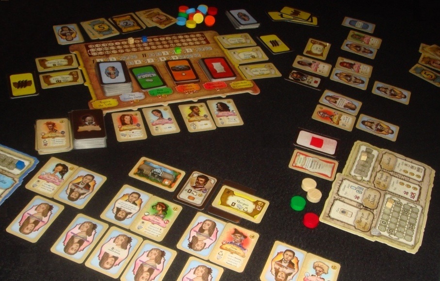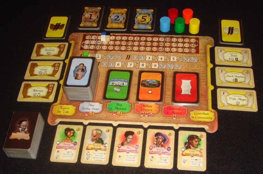 В центре стола располагается поле с дополнительными действиями, которое организует все игровые карты. Отличие этих действий в том, что каждое из них может быть выполнено лишь один раз за раунд и только одним игроком. Вверху поля идёт трек победных очков, ниже – счётчик раундов и поколений. Итак, денежки взяли, доход отметили, карты добрали – всё, можно начинать.