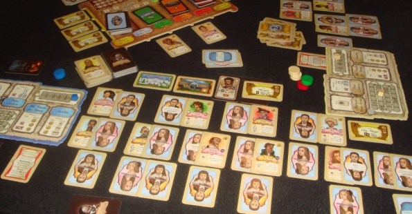 Ладно, переходим к плюсам оформления. Понравилась идея со свойствами детишек, я имею в виду то, что они срабатывают тогда, когда их можно прочитать (карты-то переворачиваются). Отлично продуманы символы: мешочек для дохода, но монета – для денег, щит для престижа, но звезда для сиюминутных очков. Всё очень наглядно и запоминается без проблем. Что касается карт, то казалось бы, разноцветные рубашки слишком простоваты, но они реально помогают не только в сортировке карт, но и во время партии – ориентируешься моментально. Ну и главный для меня плюс – это стиль в котором оформлены карты друзей. Конечно, он на любителя, кто-то, к примеру, терпеть не может карикатуры. Я лично к ним отношусь равнодушно. Но тут шуточные картинки сглаживают серьёзность процесса и придают игре некую лёгкость, заставляют улыбнуться.