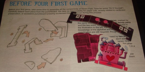 Начну, как обычно с оформления. Иллюстрации небезызвестной Marie Cardouat (Диксит) сразу намекают на то, что перед нами лёгкая и несерьёзная игра. И это действительно так. Непонятно только, зачем надо было приплетать стимпанк – данный стиль, или правильнее будет сказать, направление, можно распознать лишь через металлических свиней и дым, клубящийся над аттракционами.