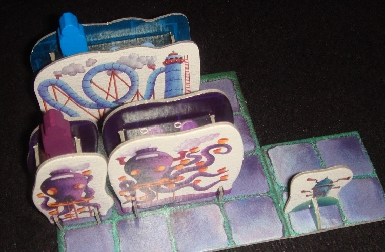 • Объёмность компонентов и выставление миплов непосредственно на аттракционы – это жирный плюс к внешнему виду и атмосфере. Да, складные картонки – не идеал, но со своей задачей они справляются, получается настоящий мини парк со своими рядами стендов, закрученными горками и посетителями.