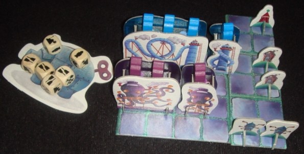 1. Броски кубиков. Все по команде начинают одновременно швырять свои кубы с целью “накидать” нужные грани. Кубики можно перебрасывать сколь угодно раз, а желанный результат необходимо зафиксировать на картонном хрюнделе, оттуда кубики забирать уже нельзя. Если с бросками покончили – быстренько хватаем тайл порядка хода. Когда все места, кроме последнего, распределились, то у самого медленного игрока остаётся ещё три попытки.
