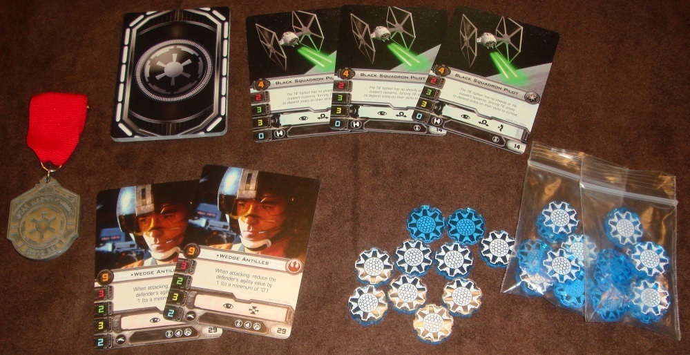 Судьба медали… ах, да, забыл рассказать про призы. За первое место вручался металлический орден, карта Веджа с альтернативным артом и десяток пластиковых жетонов брони. Второе место – жетоны и Ведж, третье – жетоны. Также всем без исключения досталась карточка (в нашем случае – карточки) простого пилота Тая с альтернативным артом.