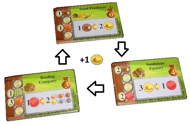 Так как в конце партии победные очки принесут только здания, то задача игрока очевидна. Для благоприятного результата для начала желательно обзавестись парочкой зданий на конвертацию ресурсов, а потом продолжать строить по две-три за раунд. Так как обновление рынка происходит только в конце раунда, то нужно попытаться выжать из доступных тайлов по максимуму.