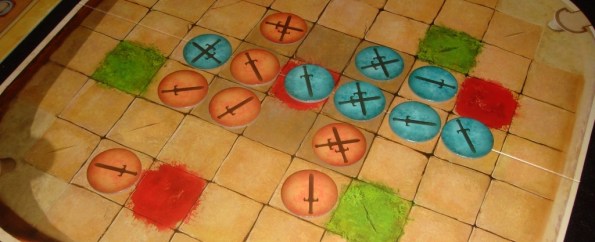 Ход игрока предельно прост: есть два действия, каждое из которых можно потратить либо на выставление фишки обычного воина, либо на суммон – розыгрыш карты с руки. Обычные воины являются своеобразным строительным материалом для различных хитрых и не очень комбинаций, необходимых для призыва более сильных существ, на карточках которых эти комбинации и показаны. Так вот, подготовив почву, то есть выложив нужную комбинацию, игрок может потратить действие и разыграть соответствующую карту воина с руки, выложив жетон на указанное место и разыграв его свойство. Обычно свойства позволяют уничтожить вражеские фишки, переместить свои или просто дают дополнительные действия. Также сила/возможность активации свойств некоторых существ может зависеть от месторасположения специальных цветных клеток, которыми усеяна арена.