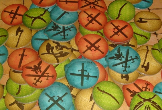 В коробке идут три уникальные фракции существ, каждой из которых соответствует своя колода воинов (18 карт) и набор жетонов (20 штук). Одна из фракций представлена в двойном экземпляре, но в разных цветах – это для того, чтобы у игроков была возможность сразиться одними и теми же наборами карт, не сетуя на какие-либо преимущества или недостатки отдельно взятой армии.