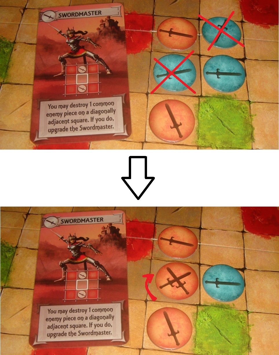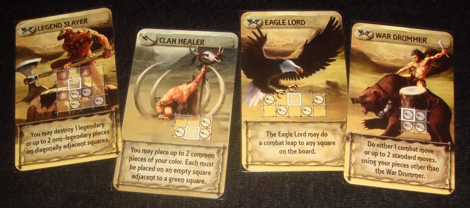 Правда, тут есть некоторые нюансы. Допустим, обычное движение позволяет уничтожить существо только рангом ниже себя, а боевое – ещё и равное по силе. С призывом то же самое, только тут всегда можно уничтожить вражеский жетон такого же ранга или ниже, разумеется, если он находится в клетке, куда осуществляется призыв. Напомню, что воины бывают трёх рангов: самые слабые – обычные, потом идут героические, и самые сильные – легендарные.