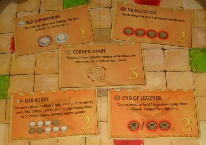 Ход игрока предельно прост: есть два действия, каждое из которых можно потратить либо на выставление фишки обычного воина, либо на суммон – розыгрыш карты с руки. Обычные воины являются своеобразным строительным материалом для различных хитрых и не очень комбинаций, необходимых для призыва более сильных существ, на карточках которых эти комбинации и показаны. Так вот, подготовив почву, то есть выложив нужную комбинацию, игрок может потратить действие и разыграть соответствующую карту воина с руки, выложив жетон на указанное место и разыграв его свойство. Обычно свойства позволяют уничтожить вражеские фишки, переместить свои или просто дают дополнительные действия. Также сила/возможность активации свойств некоторых существ может зависеть от месторасположения специальных цветных клеток, которыми усеяна арена.