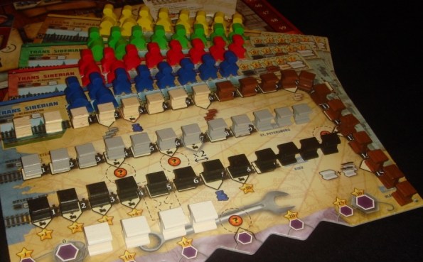 Игроки начинают с самых простейших рельсов чёрного цвета. По ходу партии их можно улучшить, сперва на серые, затем на коричневые, потом на бежевые и, наконец, на большие белые. Апгрейд происходит в строгом порядке и только с помощью бонусов на Транссибе. Сделав улучшение, игрок тут же берёт соответствующие фишки и ставит их на начало своих путей – теперь их тоже можно продвигать, но не дальше, чем старые рельсы. То есть, чтобы проложить самые продвинутые белые, необходимо сначала подвинуть все остальные. Зачем так заморачиваться? Дело в том, что, чем круче ваша дорога, тем больше очков она “вырабатывает”. Например, одно деление дороги, где проложена белая рельса, каждый ход принесёт игроку семь очков. К слову, чёрные рельсы не приносят очков вообще.