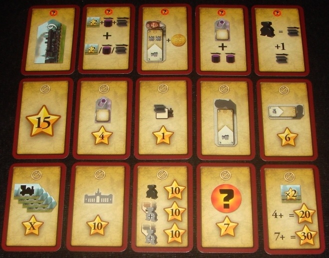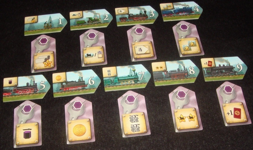 Плюшки бывают самые разные: от апгрейда рельс и дополнительного рабочего до конца партии, до самого мощного локомотива или взятия карты тайной цели, приносящей очки за определённые достижения.