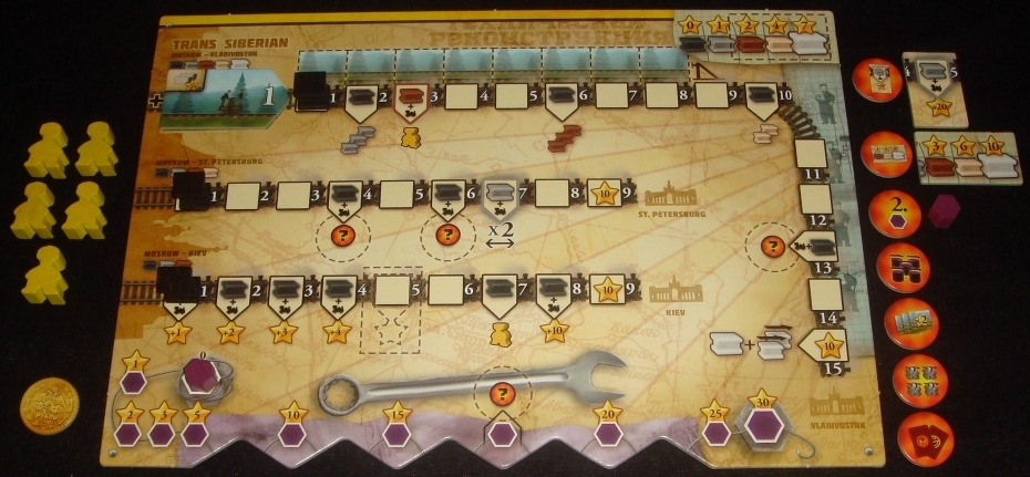 Планшеты у всех одинаковые, на них изображены три ветки: Москва – Владивосток или Транссибирская магистраль, Москва – Санкт-Петербург и Москва – Киев. Маршруты представлены линиями, поделёнными на прямоугольные участки под фишки рельс. Прокладывается дорога очень просто – продвижением фишки. Попутно фишка активирует различные бонусы. Некоторые бонусы требуют наличия не только рельсов, но и локомотива с соответствующей дистанцией “покрытия”. Другими словами, локомотив с цифрой пять сможет “запитать” только первые пять клеток.