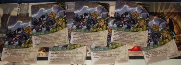 Ну, вот, осталось только выбрать план, по которому будет действовать суперзлодей. На карточке плана указаны дополнительные правила подготовки, условия поражения героев, а также количество специальных карт плана, которые тоже идут в колоду зла и при выходе активируют плохое событие или банально приближают игроков к поражению.