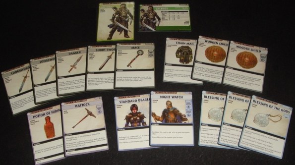 Итак, с чего же начинается приключение рядового следопыта. Сперва выбранному персонажу необходимо составить колоду или, если рассуждать тематически, набить ему рюкзак всякими полезностями. Количество карт каждого типа указано опять же на карточке. Игрок вправе сам решать, с чем он пойдёт на первое задание, а для ленивых в конце правил приводится рекомендуемый состав колоды для каждого из героев. По закону жанра персонажи друг от друга отличаются: у вояки в инвентаре куча мечей, у мага целая книга заклинаний и т.д.