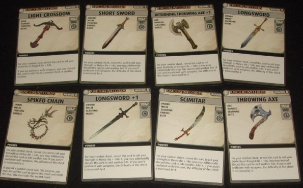 Теперь рассмотрим, что или кого можно встретить на своём пути во время приключения, и как с этим бороться. Основная угроза – это, конечно же, враги. Они требуют пройти боевую проверку. Боевая и, вообще, любая проверка – это бросок кубика, число граней на котором зависит от того, насколько силён ваш герой в том или ином навыке. Если во время встречи с монстром на руках у вас имеется подходящее оружие, то к кубику навыка можно добавить кубик оружия, тем самым увеличив вероятность успеха. Причём в данной игре, при использовании чего-либо, карту в большинстве случаев достаточно просто показать.