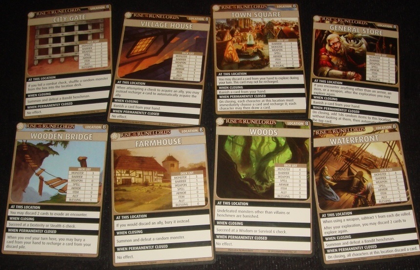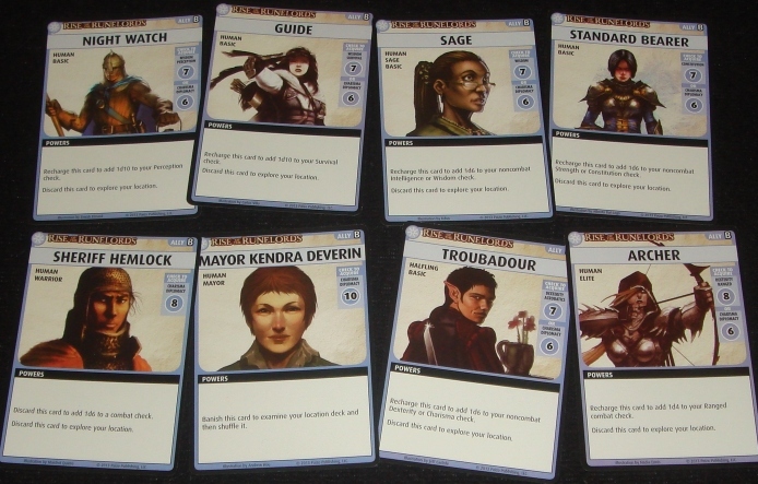 Для начала все выбирают стартовую локацию, помечая своё пребывание на ней специальной картой, именуемой в правилах “жетоном”. Непонятно, почему для персонажей нельзя было сделать обычные жетоны или жетоны с подставками, как в Аркхэме, ну да ладно. После этого (или перед – не столь важно) игроки тянут стартовую руку. Напомню, что приключение все начинают с колодами в 15 карт. С лимитом карт на руках тут такая же история, как и с навыками и способностями – его можно прокачать, и он отличается: у война на конец хода карт может быть всего четыре штуки, в то время, как у мага целых шесть. Тут ещё стоит упомянуть, что у каждого персонажа имеется предпочтительный тип карт, и если на старте ему “не выпало” ни одной такой карты, то рука сбрасывается и тянется новая – пока не придёт то, что нужно. Такой вот своеобразный муллиган.