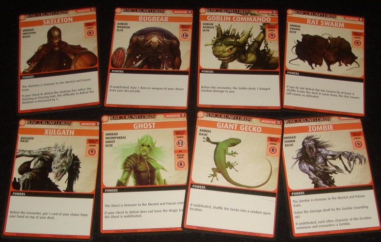 Теперь рассмотрим, что или кого можно встретить на своём пути во время приключения, и как с этим бороться. Основная угроза – это, конечно же, враги. Они требуют пройти боевую проверку. Боевая и, вообще, любая проверка – это бросок кубика, число граней на котором зависит от того, насколько силён ваш герой в том или ином навыке. Если во время встречи с монстром на руках у вас имеется подходящее оружие, то к кубику навыка можно добавить кубик оружия, тем самым увеличив вероятность успеха. Причём в данной игре, при использовании чего-либо, карту в большинстве случаев достаточно просто показать.