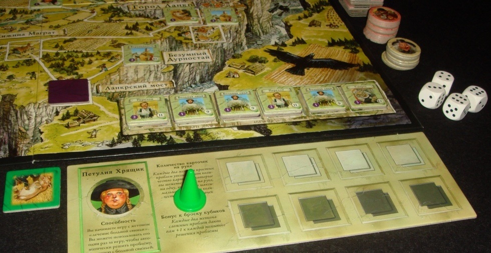 В этом и заключается суть игры: ходим/летаем по карте, решаем проблемы, избавляем Ланкр от кризисов. Есть ещё пара нюансов. К примеру: ведьмы на одной клетке могут “попить чайку”, что означает сбросить некоторое количество жетонов хихиканья. Сложные фиолетовые проблемы в случае неудачной попытки приводят к какому-то неблагоприятному событию, частенько затрагивающему всех учениц (допустим, заставляют сбросить по одной решённой проблеме). Можно тут собрать и мега-комбинацию из карт с пометкой “сила трёх”, с помощью которой можно справиться с абсолютно любой проблемой, правда, необходимо, чтобы персонажи на картах были разные. Я пробовал, но за пять партий так ни разу и не собрал, хотя некоторым редко, но удавалось.
