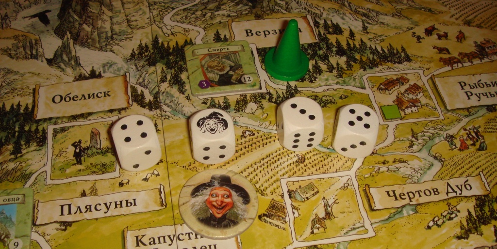 Итак, продолжим. После броска второй пары кубиков магией и головологией пользоваться уже нельзя, но можно играть карты со спец-свойствами, например, позволяющие перебросить кубики и т.д. Затем результат с кубиков и карт суммируется и сравнивается со сложностью проблемы. Если больше равно, то всё в ажуре – проблема решена, игрок забирает жетон себе и кладёт на карточку. Если же ведьму постигла неудача, то она опять же получает жетон хихиканья и отступает на свободное место.