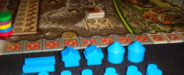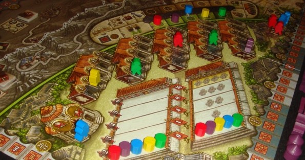 Действия выбираются с помощью ставок, игроки просто размещают своих рабочих в здания на те цены, которые они готовы заплатить. Каждое здание обозначает конкретное действие. Фишка тут в том, что с первых двух самых дешёвых делений тебя могут прогнать, а гарантированно застолбить за собой можно только более дорогое место.