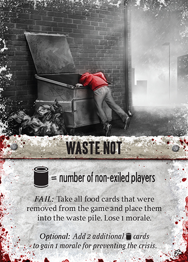 Стремясь к общей цели, и не забывая про личную, игроки своими действиями нередко будут вызывать подозрение, так как свойства и требования большинства карт специально задуманы таким образом, чтобы посеять семя раздора среди выживших, казалось бы, крепко сплотившихся общим горем. К примеру, одна из личных целей требует от игрока заныкать дефицитную еду, – понятно, что остальным это не понравится.