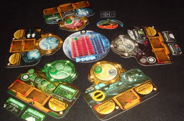 Тут можно улучшать бойцов и даже сами модули! Дело в том, что у каждой фракции имеется домашняя локация, закончив движение в которой, игрок может взять жетончик улучшения. С помощью этих жетонов можно прокачивать бойцов (жетон переворачивается) и усилять свойства установленных модулей – допустим, чтобы ловушка наносила больше ранений. Крутость же бойцов зависит от фракции, к примеру, прокаченные учёные смогут хоть как-то атаковать, а пришельцы получать очки информации, по которым также можно победить.