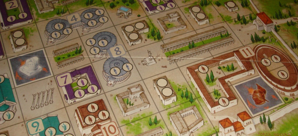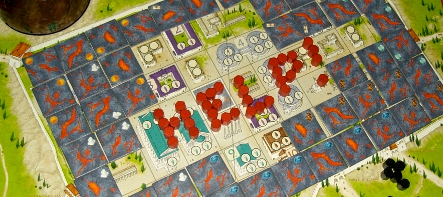 Помните, я говорил об одном дополнительном правиле при выходе первой карты извержения. Так вот, правило можно назвать как “родственник приехал!”. Дело в том, что помещая фишку в здание, где уже кто-то обосновался, игрок получает возможность выставить столько бонусных фишек, сколько находилось в здании до него. Дополнительные фишки можно поместить только в здания того же цвета или в нейтральные. Проще говоря, если в момент заселения, в здании уже были двое квартирантов, то в дополнение к выставленной фишке, можно разместить ещё две. Тематически это можно объяснить так, мол, жители, почуяв неладное, начинают созывать родню со всей округи и в спешке паковать чемоданы. Или по-другому, к примеру, помпейцы просто начинают усиленно размножаться, чтобы было кому жить на новом месте.