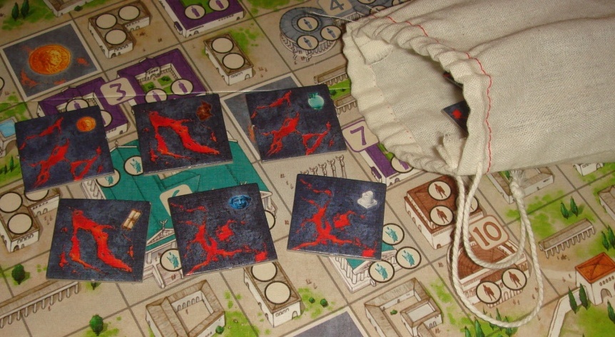 Часть вторая – разрушительная. После начала извержения игроки сбрасывают оставшиеся карты – они им больше не понадобятся. Теперь в ход идёт мешочек с тайлами. Из него тянется шесть штук и размещаются на поле в соответствии с символами. Это отправные точки горящей лавы, которая будет постепенно растекаться и нещадно накрывать здания вместе с их жителями.
