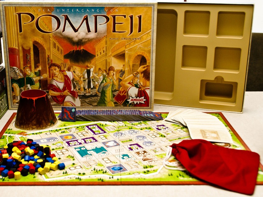 Из-за редких переизданий игрушка до сих пор остаётся как-то в тени, никто её особо не обсуждает, ничего о ней не пишет. А ведь автор у неё ни кто иной, как Klaus-Jürgen Wrede, известный своей нестареющей классикой Carcassonne. Впервые The Downfall of Pompeii была выпущена в 2004 году немецкой компанией AMIGO Spiel. Спустя пару лет стараниями Mayfair Games игра вышла на английском языке, но и тогда большой популярности не сыскала. Видимо поэтому Mayfair организовали репринт только в прошлом году, и то “по многочисленным просьбам трудящихся”, периодически вздыхавших на форумах.