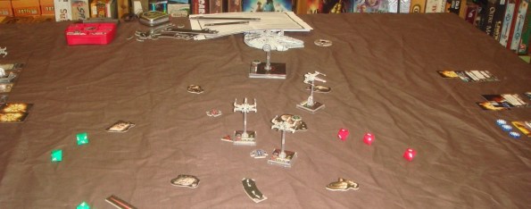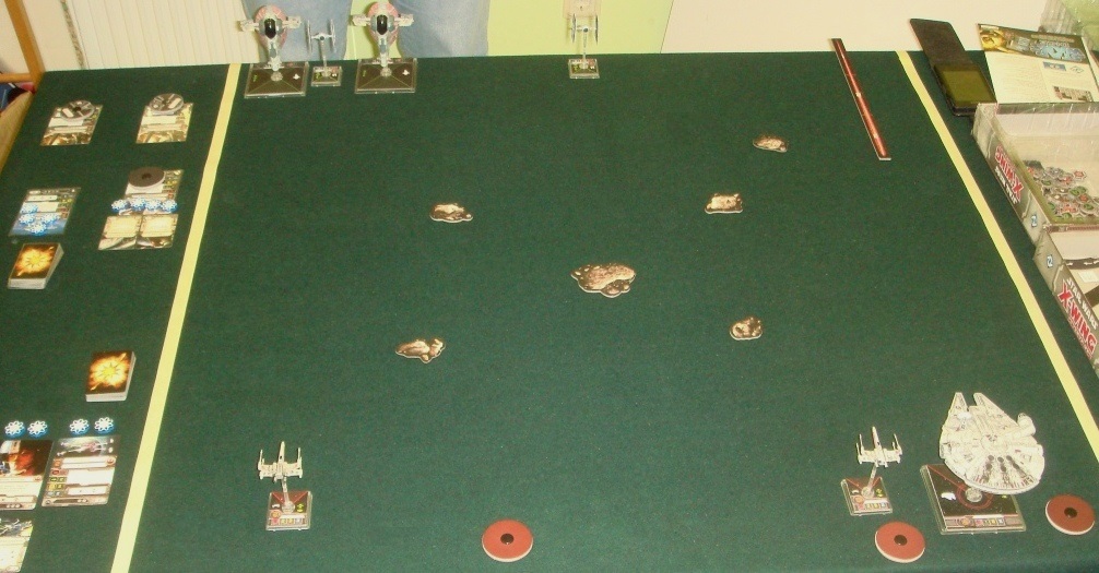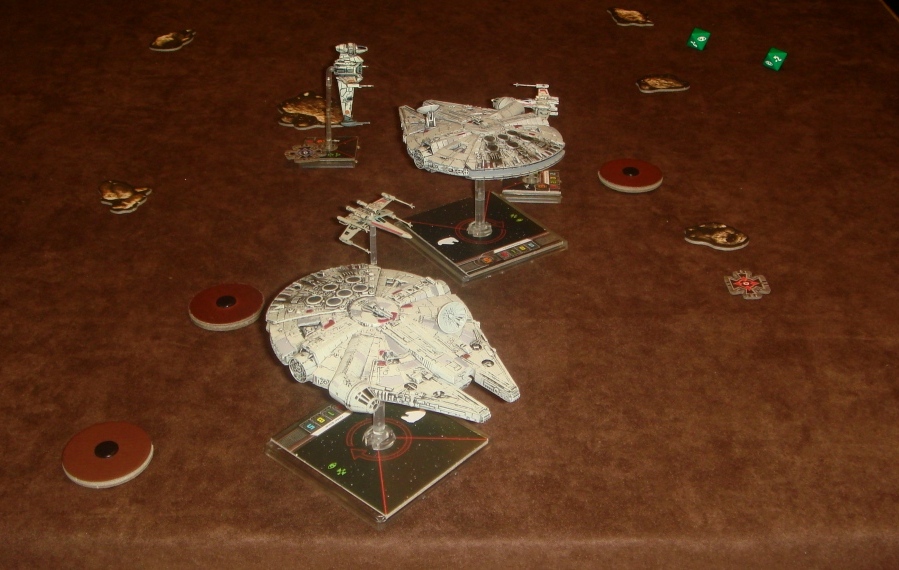 Первый фраг был за мной, но плата за него оказалась чересчур высокой, – почти все мои корабли были серьёзно покалечены. Ошибкой было то, что в начальной расстановке я отделил новобранца от звена (должен был стать приманкой), из-за чего он пару ходов как-то неуклюже разворачивался и, как следствие, выпал из боя. Когда мне удалось сбить второй Тай, ситуация была уже критической. Все три корабля тарахтели еле живые, а вот Слэйвы соперника летали целёхонькие. Спасло меня только время. Ещё один раунд, ещё одно попадание по Соколу, и партия завершилась бы не в мою пользу. А так, 3 вымученных очка в поединке, где я на себе ощутил “прелесть” неудачных бросков.