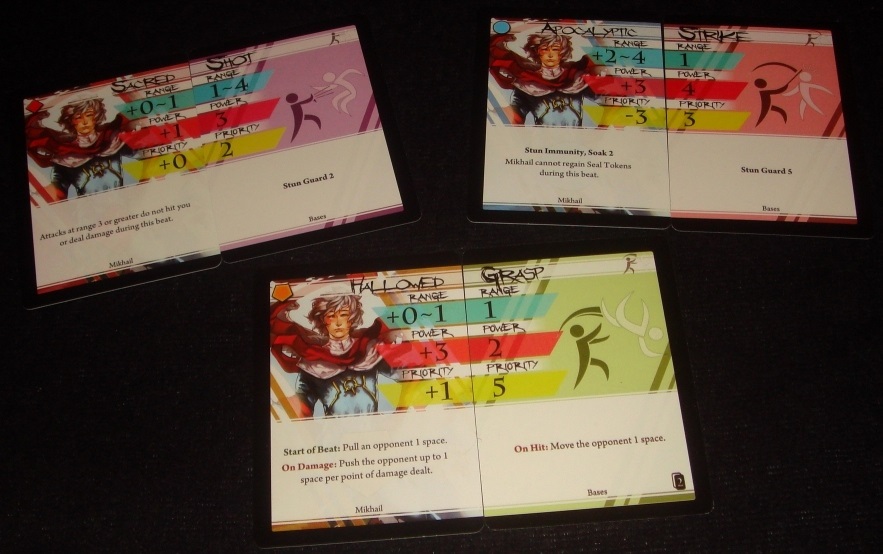 Возьмём, к примеру, простого парня Михаила. Колода Миши состоит из карточки персонажа, памятки, 5 карт стиля, 1 карты уникального базового приёма, 1 карты спец-удара и 3 маркеров. Во время боя понадобится жетон героя на подставке и счётчик-крутилка для очков здоровья.