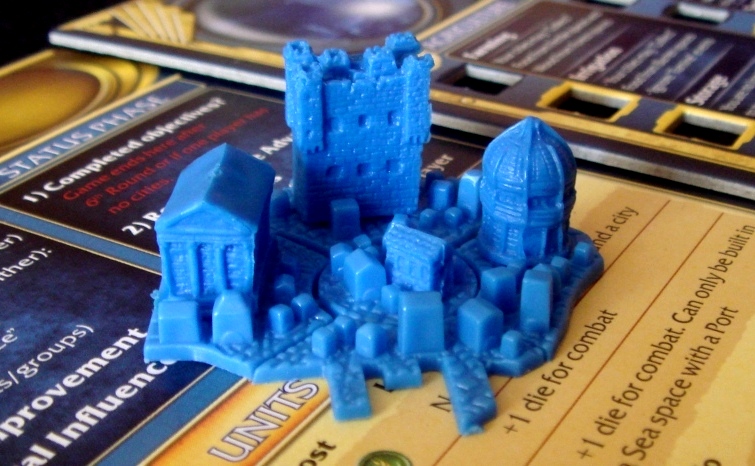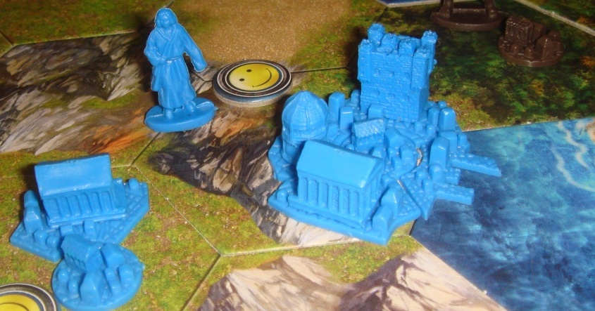 6. Культурное влияние. Довольно хитрое действие, позволяющее переманивать здания на свою сторону. Дальность влияния обуславливается размером города (плюс её можно увеличить жетонами культуры), а успех “обращения” зависит от броска кубика. На 5 или 6 игрок заменяет одно из зданий соперника на такое же своё. Влиять таким образом можно только на “пристройки”, начальное поселение заменить нельзя. Замена никак не влияет на здание или город – постройки всё также остаются за соперником. Плоды она приносит только в конце партии, когда за каждое здание своего цвета игрок получает одно очко.