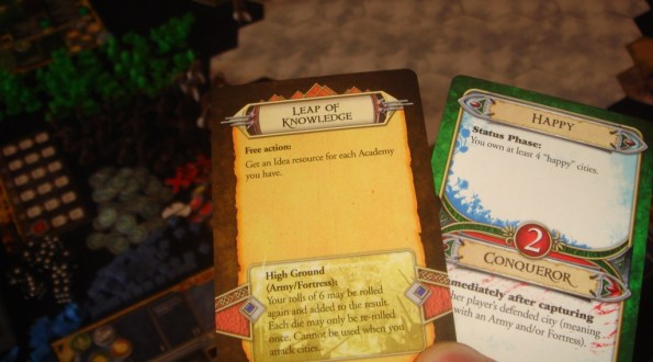 Теперь от мелочей к претензиям посерьёзней. Для меня основной проблемой оказался жутчайший дисбаланс карт действий и целей. Уж больно они ситуативны и неравноценны. Если вам не везёт с действиями и целями, то это просто катастрофа. Пока ты ищешь подходящий момент, чтобы получить хоть какой-то бонус, соперники получают такие бонусы каждый ход. А про цели я вообще молчу, некоторые ну очень специфические, тогда как другие можно выполнить “мимоходом”, особо не напрягаясь. Когда у всех были “освой эту категорию технологий” или “имей хотя бы пять еды”, а у меня “сделай 4 города счастливыми”, хотелось просто рвать и метать. С военными задачами та же история – “убей двух варваров”, когда вокруг ни души, отнюдь не радовало.
