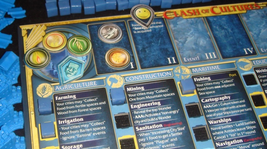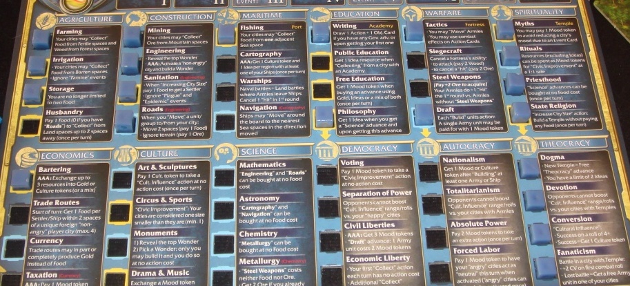 Освоенная технология помечается кубиком, а цвет рамки вокруг отверстия укажет, какой из жетонов, настроения или культуры, получает игрок (и какой маркер двигается на треке ресурсов). Три нижние серые категории относятся к системам управления государством, и чтобы начать любую из этих веток, придётся изучить дополнительную технологию, расположенную непосредственно над ней.