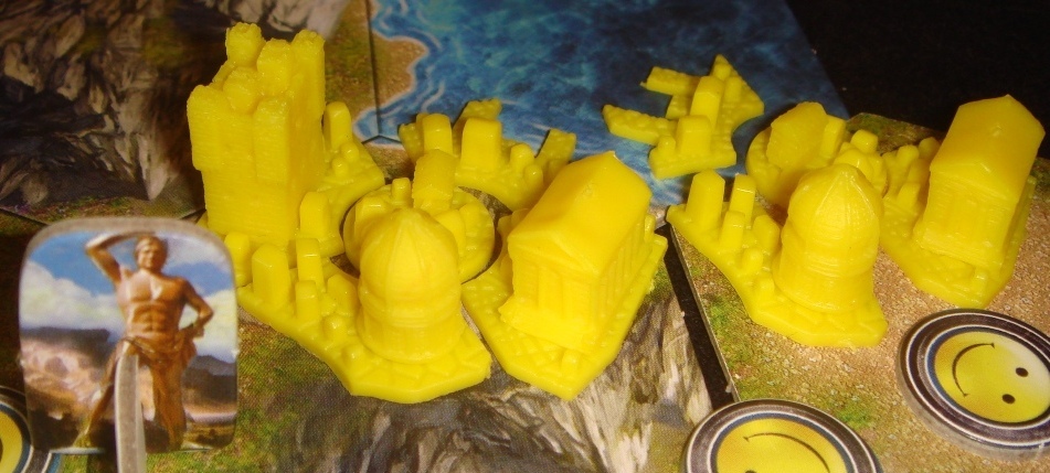 Жаль, конечно, что Чудеса Света выполнены в виде жетонов на уродливых картонных подставках. Могли бы раскошелиться на несколько фигурок, ведь таких построек не так уж много.