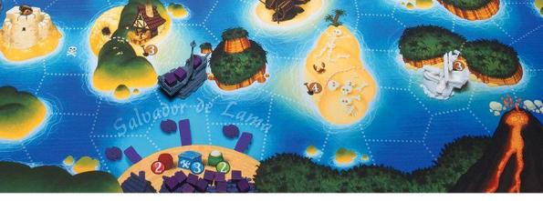Пиратский корабль, разумеется, нацелен исключительно на грабежи. Когда он оказывается рядом с торговым судном соперника, то безнаказанно забирает себе часть груза. Помимо этого, успешная операция приносит пиратам бонус в виде двух дублонов. Но и это ещё не всё. Если пиратам удаётся надёжно спрятать награбленное на одном из островов, то они получат ещё немного монет сверху. К сожалению, трюмы пиратских корыт не такие вместительные, поэтому одновременно они способны транспортировать только один товар (кубик). Выход – быстро закапывать добычу, и снова на дело.