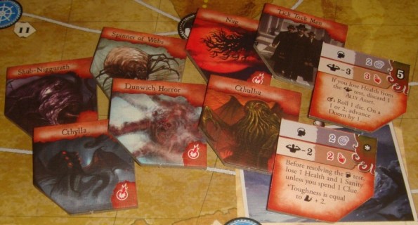 Ну, и самый большой минус для меня – это урезанность базы. Я говорил, что реиграбельность в рамках одной партии неплоха, но если говорить в целом, то четыре Древних и по 8 карт городских контактов – это ничтожно мало. Четыре победы, и что дальше? А дальше, разумеется, дополнения, коих у FFG заготовлено вагон и маленькая тележка. Дополнения, к слову, урезаны не хуже базы, в первом (Forsaken Lore), к примеру, только один новый Древний, остальное – это по чуть-чуть карт каждого типа.