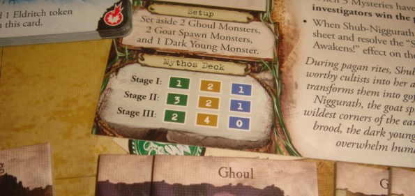 Она составляется согласно карточке босса: берём для каждого этапа Мифы указанных цветов, отдельно перемешиваем полученные стопки, после чего кладём их одну на другую. Главное не перепутать!
