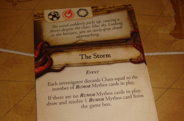 С помощью карт Мифов можно ещё и регулировать сложность игры. Дело в том, что некоторые из них по бокам помечены либо щупальцами, либо светлыми узорами. Первые – это более сложные Мифы с очень неблагоприятными событиями, вторые – более простые или вовсе с позитивными для героев эффектами. Хотим лёгкой прогулки – убираем щупальца, хотим хардкора – возвращаем в коробку светлые карты.