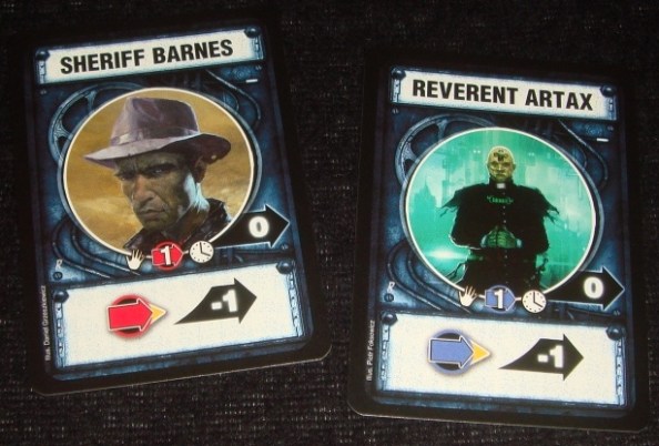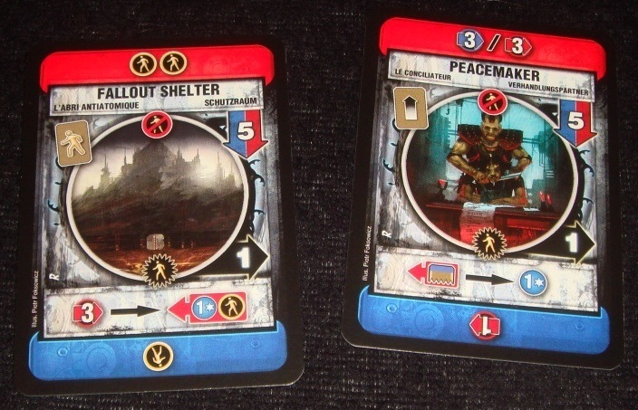Есть также пара карт и с прямым и довольно агрессивным влиянием на соперников. Fallout Shelter позволяет забирать одного рабочего и очко у оппонента за жетон захвата с дистанцией 3 и больше. Очки забираются только с базы и в данном случае перемещаются на карту Fallout Shelter. Peacemaker же разрешает сбрасывать соглашения у других игроков, и даёт за это одно очко.
