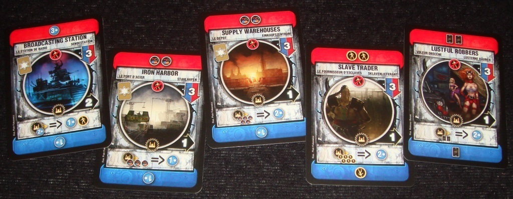Новые производственные локации поощряют добычу (в фазу производства) ресурсов, рабочих, карт и победных очков. Причём, награда “накопительная”, то есть очки присуждаются за каждый произведённый набор.